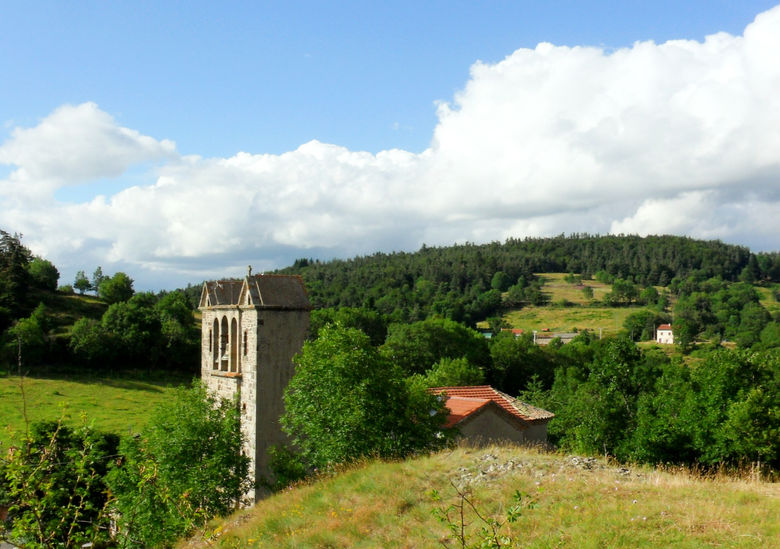 L’église avec son clocher peigne, date des années 1880. Si sa façade se fait une vague inspiration de la cathédrale du Puy, elle partage comme son modèle, le même matériau : les roches volcaniques. Celles-ci proviennent de l’ancienne église située sur le piton rocheux tout à côté et qui était devenue trop petite.